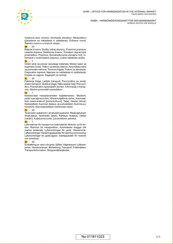 為進一步擴大國際市場,山東中運物流有限責(zé)任公司展開在歐盟申請注冊“中運”商標(biāo)的工作,歐盟商標(biāo)體制是歐盟會議通過的一種在歐盟28個國家使用的商標(biāo)體制。2013年9月,中運物流商標(biāo)成功的在歐盟完成注冊!就此敲開了中運物流在歐盟市場的大門!